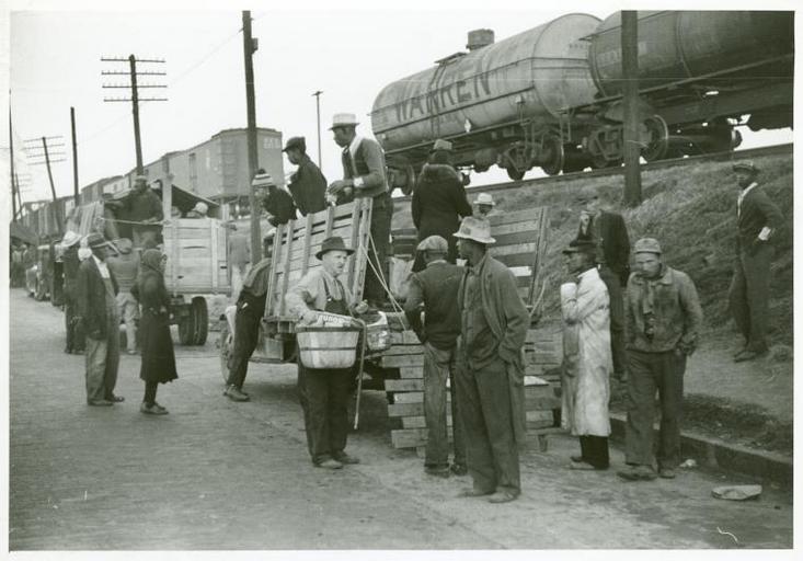 | Keywords: new york public library newyorkpubliclibrary dc:identifier=http://digitalgallery.nypl.org/nypldigital/id?1260216 dc:identifier=httpdigitalgallerynyplorgnypldigitalid1260216 xmlns:dc=http://purl.org/dc/elements/1.1/ xmlns:dc=httppurlorgdcelements11 dc:coverage=1939 day laborers daylaborers memphis tenn. tenn african american agricultural laborers africanamericanagriculturallaborers farm trucks farmtrucks tennessee cotton pickers cottonpickers depression era depressionera Digital ID: 1260216. [African American day laborers standing near and on the back of farm trucks parked on the side of a road near the Hallan Bridge while drivers bid and offer them between 50 cents and one dollar to work as cotton pickers on Mississippi and Arkansas plantations, Memphis, Tennessee, October 1939.. Wolcott, Marion Post -- Photographer. October 1939   Notes:  Original negative #: 30631-M5; Caption on back: 'Day laborers being hired for cotton picking on Mississippi and Arkansas plantations. Between about 4 to 6:30 A.M., every morning during the season near the Hallan Bridge in Memphis, Tennessee crowds of negroes in the streets gather and are loaded into trucks by drivers who bid and offer them from 50 cents per day to $1.00. October 1939.'   Source: Farm Security Administration Collection. / Tennessee.  / Marion Post Wolcott. (more info)   Repository: The New York Public Library. Schomburg Center for Research in Black Culture. Photographs and Prints Division.   See more information about this image and others at NYPL Digital Gallery. Persistent URL: digitalgallery.nypl.org/nypldigital/id?1260216   Rights Info: No known copyright restrictions; may be subject to third party rights (for more information, click here) Digital ID: 1260216. [African American day laborers standing near and on the back of farm trucks parked on the side of a road near the Hallan Bridge while drivers bid and offer them between 50 cents and one dollar to work as cotton pickers on Mississippi and Arkansas plantations, Memphis, Tennessee, October 1939.. Wolcott, Marion Post -- Photographer. October 1939   Notes:  Original negative #: 30631-M5; Caption on back: 'Day laborers being hired for cotton picking on Mississippi and Arkansas plantations. Between about 4 to 6:30 A.M., every morning during the season near the Hallan Bridge in Memphis, Tennessee crowds of negroes in the streets gather and are loaded into trucks by drivers who bid and offer them from 50 cents per day to $1.00. October 1939.'   Source: Farm Security Administration Collection. / Tennessee.  / Marion Post Wolcott. (more info)   Repository: The New York Public Library. Schomburg Center for Research in Black Culture. Photographs and Prints Division.   See more information about this image and others at NYPL Digital Gallery. Persistent URL: digitalgallery.nypl.org/nypldigital/id?1260216   Rights Info: No known copyright restrictions; may be subject to third party rights (for more information, click here)  Digital ID: 1260216. [African American day laborers standing near and on the back of farm trucks parked on the side of a road near the Hallan Bridge while drivers bid and offer them between 50 cents and one dollar to work as cotton pickers on Mississippi and Arkansas plantations, Memphis, Tennessee, October 1939.. Wolcott, Marion Post -- Photographer. October 1939