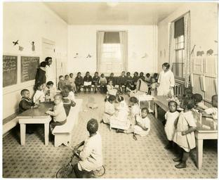 | Keywords: library company philadelphia history african americana africanamericana classroom education library company of philadelphia librarycompanyofphiladelphia african american students africanamericanstudents teachers monochrome Depicts two African American women teachers overseeing a class of African American grade school children. The younger children play on the floor and at tables with blocks. The older ones sit and read on benches lining the wall. On the floor, a group of girls play with white dolls as others ride on tricycles and push a carriage. One teacher stands by two blackboards; one board lists the names of good and bad boys, and the other of good and bad girls. Stencils of wild animals and playing white children decorate the walls. p-8846-29 Link to record on ImPAC, the Library Company’s digital collections catalog: lcpdams.librarycompany.org:8881/R/-?func=dbin-jump-full&a... Depicts two African American women teachers overseeing a class of African American grade school children. The younger children play on the floor and at tables with blocks. The older ones sit and read on benches lining the wall. On the floor, a group of girls play with white dolls as others ride on tricycles and push a carriage. One teacher stands by two blackboards; one board lists the names of good and bad boys, and the other of good and bad girls. Stencils of wild animals and playing white children decorate the walls. p-8846-29 Link to record on ImPAC, the Library Company’s digital collections catalog: lcpdams.librarycompany.org:8881/R/-?func=dbin-jump-full&a... |