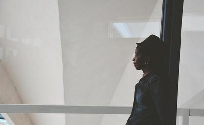 Keywords: african american woman hat fedora denim jacket fashion clothes window