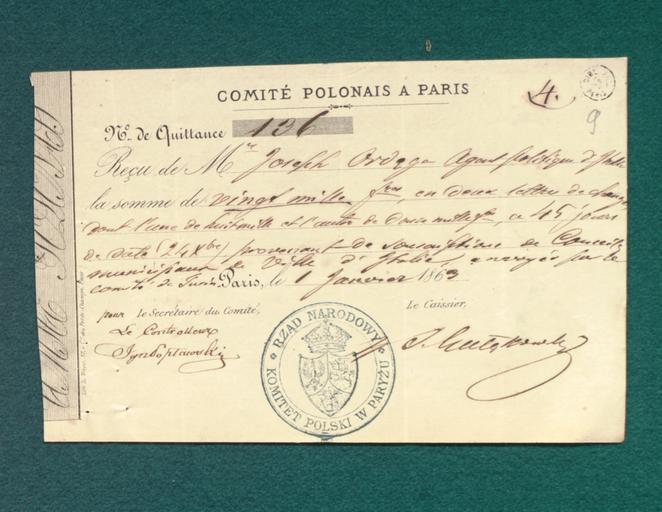 | Keywords: AGAD (3) Rachunek Komisji, PudÅ‚o 660-12 s. 9.png žDowody do rachunków Józefa OrdÄ™gi Komisarza w Paryżu i Agenta Politycznego we WÅ‚oszech i Szwajcarii <br /> Komitet Polski w Paryżu kwituje sumy otrzymane od Józefa OrdÄ™gi agenta politycznego we WÅ‚oszech<br /> RzÄ…d Narodowy prowadziÅ‚ dziaÅ‚alność także za granicÄ… gdzie miaÅ‚ wiele swych agend ByÅ‚y to placówki dyplomatyczne - konsulaty polskie urzÄ™dy komisarzy peÅ‚nomocnych i organizatorów wojskowych oraz instytucje do okreÅ›lonych zadaÅ„ TakÄ… instytucjÄ… byÅ‚ Komitet Polski w Paryżu powoÅ‚any dekretem z 3 V 1863 r którego przewodniczÄ…cym zostaÅ‚ ks WÅ‚adysÅ‚aw Czartoryski także główny peÅ‚nomocnik dyplomatyczny RzÄ…du do spraw polityki zagranicznej Sekretarzem Komitetu byÅ‚ Józef OrdÄ™ga Gdy pozycja Komitetu zaczęła sÅ‚abnąć rozwiÄ…zany w maju 1864 r od 5 XI 1863 r jego atrybucje dotyczÄ…ce prasy zostaÅ‚y powierzone Agencji Dyplomatycznej Paryskiej WydziaÅ‚owi Druków natomiast dotyczÄ…ce spraw wojskowych “ agentowi wojskowemu RzÄ…du Narodowego w Paryżu i agentowi broni w Liége Oba stanowiska zajmowaÅ‚ byÅ‚y dyrektor WydziaÅ‚u Wojny RzÄ…du Narodowego “ pÅ‚k Eugeniusz Kaczkowski-DÄ™biÅ„ski PowoÅ‚ano także agencje do zakupu i dostaw broni m in Komisja Broni w Legie z Aleksandrem Guttrym na czele Dekretem RzÄ…du Narodowego z 5 VII 1863 r zostaÅ‚a powoÅ‚ana Komisja DÅ‚ugu Narodowego Krajowego w skÅ‚adzie ks WÅ‚adysÅ‚aw Czartoryski Józef OrdÄ™ga dr Seweryn Gałęzowski w zwiÄ…zku z ogÅ‚oszeniem pożyczki przymusowej w wysokoÅ›ci 21 mln zÅ‚p najpierw u zamożniejszych kapitalistów krajowych zamienionÄ… na ogólnÄ… pożyczkÄ™ narodowÄ… w wysokoÅ›ci 40 mln zÅ‚p i zabezpieczonÄ… na caÅ‚ym majÄ…tku narodowym Komisja zobowiÄ…zana zostaÅ‚a do prowadzenia Wielkiej KsiÄ™gi DÅ‚ugu Narodowego oraz przygotowania wespół WydziaÅ‚em Skarbu RzÄ…du Narodowego obligacji pożyczkowych Na potwierdzenie wpÅ‚ywów pożyczki WydziaÅ‚ Skarbu wydaÅ‚ specjalne kwity tymczasowe Zbieraniem i wydatkowaniem Å›rodków pieniężnych kierowaÅ‚y w okresie powstania nie tylko centralne ale także lokalne wÅ‚adze powstaÅ„cze oraz dowódcy oddziałów Dokumenty skarbowe znajdowaÅ‚y siÄ™ także w innych paÅ„stwach Europy - tam gdzie istniaÅ‚y jakiekolwiek wÅ‚adze czy agentury powstaÅ„cze Komisja DÅ‚ugu Narodowego swym zasiÄ™giem obejmowaÅ‚a kraj i zagranicÄ™ gdzie docieraÅ‚a do zamożniejszych Polaków i prowadziÅ‚a rokowania z finansistami francuskimi o zaciÄ…gniÄ™cie u nich pożyczki w wysokoÅ›ci 30 mln franków Na podstawie rozporzÄ…dzenia WydziaÅ‚u Skarbu RzÄ…du Narodowego z 15 XII 1863 r do kasy Komisji miaÅ‚y być wnoszone także skÅ‚adki i ofiary zebrane za granicÄ… przez Komitet Polski Wszystkie te fundusze byÅ‚y w dyspozycji WydziaÅ‚u Skarbu RzÄ…du Narodowego któremu Komisja podlegaÅ‚a W archiwum Komisji DÅ‚ugu Narodowego stanowiÄ…cej centralnÄ… kasÄ™ zagranicznÄ… powstania znajdowaÅ‚y siÄ™ bogate materiaÅ‚y do stanu skarbu i polityki finansowej wÅ‚adz narodowych tego okresu W poÅ‚owie lipca 1863 r na agenta RzÄ…du Narodowego w Turynie wyznaczony zostaÅ‚ Józef OrdÄ™ga b komisarz RzÄ…du Narodowego w Paryżu sekretarz Komitetu Narodowego Polskiego i czÅ‚onek Komisji DÅ‚ugu Narodowego; od wrzeÅ›nia tego roku peÅ‚niÅ‚ on funkcjÄ™ agenta dyplomatycznego we WÅ‚oszech i Szwajcarii W latach 1863-1864 przez rÄ™ce Józefa OrdÄ™gi przeszÅ‚o ponad 630 tys franków ze skÅ‚adek polskich i zagranicznych; sumy te szÅ‚y w wiÄ™kszej części na cele wojenne w mniejszej na koszty polskiej dyplomacji i propagandy W 1868 r OrdÄ™ga uczestniczyÅ‚ w Paryżu w likwidacji dziaÅ‚alnoÅ›ci Komisji DÅ‚ugu Narodowego <br /> Archiwum Komisji DÅ‚ugu Narodowego wraz z caÅ‚oÅ›ciÄ… zbiorów spÅ‚onęło w czasie powstania warszawskiego w 1944 r Wobec jego zniszczenia wiele podstawowych zagadnieÅ„ pożyczki narodowej nie sposób dokÅ‚adnie wyjaÅ›nić Brak jest np przepisów regulujÄ…cych kwestiÄ™ przerachowania <br /> Opisywany dokument jest kwitem wystawionym przez Komitet Polski w Paryżu znajdujÄ…cym siÄ™ w pliku rachunków i kwitów Józefa OrdÄ™gi Komisarza w Paryżu i Agenta Politycznego we WÅ‚oszech i Szwajcarii W dokumencie tym kasjer S Gałęzowski i sekretarz Ignacy PopÅ‚awski potwierdzajÄ… iż otrzymali od Józefa OrdÄ™gi agenta politycznego na WÅ‚ochy sumÄ™ 20 tys franków w dwóch wekslach z których jeden opiewaÅ‚ na 8 tys franków a drugi na 12 tys PieniÄ…dze te zostaÅ‚y przekazane przez Komitet w Turynie Na kwicie znajduje siÄ™ okrÄ…gÅ‚a pieczęć tuszowa RzÄ…d Narodowy Komitet Polski w Paryżu <br /> Miejsce Paryż<br /> Opis zewnÄ™trzny Rkps na formularzu jÄ™z franc karta papierowa o wym 163x105 mm<br /> Miejsce przechowywania Biblioteka Polska w Paryżu RzÄ…d Narodowy powstania 1863-1864 Archiwum Izby Obrachunkowej w Paryżu sygn 660/12 s 9<br /> Autor komentarza SÅ‚awomir Postek<br /> Autor fotografii PaweÅ‚ PiÅ‚at 1863-01-01 Archiwum Główne Akt Dawnych author PD-old January Uprising documents Media contributed by AGAD presented in former polska pl portal Uploaded with VicuñaUploader January Uprising seals |