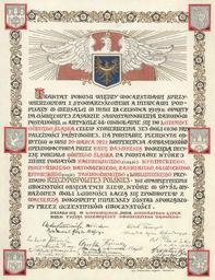 | Keywords: AGAD Akt pamiÄ…tkowy połączenia Górnego ÅšlÄ…ska z RzeczÄ…pospolitÄ….jpg Akt podpisany podczas uroczystoÅ›ci połączenia Górnego ÅšlÄ…ska z PolskÄ… która odbyÅ‚a siÄ™ w katowickim parku im T KoÅ›ciuszki z udziaÅ‚em delegacji wÅ‚adz paÅ„stwowych i miejscowego spoÅ‚eczeÅ„stwa 20 X 1921 po plebiscycie i trzech kolejnych powstaniach wielkie mocarstwa podjęły decyzjÄ™ o podziale Górnego ÅšlÄ…ska na część polskÄ… i niemieckÄ… Decyzja zobowiÄ…zaÅ‚a PolskÄ™ i Niemcy do wynegocjowania warunków o tzw okresie przejÅ›ciowym miaÅ‚ obowiÄ…zywać przez 15 lat i ochronie praw mniejszoÅ›ci narodowych na górnoÅ›lÄ…skim obszarze plebiscytowym StosownÄ… umowÄ™ zwanÄ… KonwencjÄ… GenewskÄ… obie strony podpisaÅ‚y 15 V 1922 Po miesiÄ…cu mogÅ‚y przystÄ…pić do faktycznego obejmowania przyznanych im części 16 VII w katowickim Parku KoÅ›ciuszki odbyÅ‚a siÄ™ uroczystość zespolenia ziemi Å›lÄ…skiej z RzeczÄ…pospolitÄ… W uroczystoÅ›ci uczestniczyÅ‚a delegacja polskich wÅ‚adz paÅ„stwowych i miejscowe spoÅ‚eczeÅ„stwo ZbiegÅ‚a siÄ™ ona jednak z kryzysem gabinetowym Po dymisji rzÄ…du Antoniego Ponikowskiego prawica sejmowa wysunęła na stanowisko premiera Wojciecha Korfantego do niedawna komisarza plebiscytowego Kandydaturze tej sprzeciwiÅ‚ siÄ™ Naczelnik PaÅ„stwa Józef PiÅ‚sudski W tej sytuacji PiÅ‚sudski i Korfanty uznali swój przyjazd do Katowic za niepożądany Na uroczystoÅ›ci odczytano akt symbolicznego połączenia Górnego ÅšlÄ…ska z PolskÄ… Akt podpisaÅ‚o ponad 100 osób WidniejÄ… pod nim m in podpisy nastÄ™pujÄ…cych osób Wojciech TrÄ…mpczyÅ„ski “ marszaÅ‚ek Sejmu Ustawodawczego generaÅ‚ StanisÅ‚aw Szeptycki “ dowódca wojsk polskich wkraczajÄ…cych na Górny ÅšlÄ…sk generaÅ‚ Kazimierz Horoszkiewicz “ dowódca 23 Dywizji Piechoty dr Jerzy Buzek “ radca Prezydium Rady Ministrów StanisÅ‚aw Gall “ biskup polowy wojska polskiego Józef Rymer “ wojewoda Å›lÄ…ski Zygmunt Å»urawski “ wicewojewoda Å›lÄ…ski Konstanty Wolny “ adwokat przyszÅ‚y marszaÅ‚ek Sejmu ÅšlÄ…skiego <br /> Opis zewnÄ™trzny OryginaÅ‚ jÄ™z polski 64x49 cm<br /> Miejsce przechowywania Archiwum PaÅ„stwowe w Katowicach UrzÄ…d Wojewódzki ÅšlÄ…ski w Katowicach sygn 19<br /> Autor komentarza Edward DÅ‚ugajczyk<br /> Autor Fotografii/Skanu Piotr Matuszek 1922-07-16 Archiwum Główne Akt Dawnych author PD-old Upper Silesia plebiscite Media contributed by AGAD presented in former polska pl portal Uploaded with VicuñaUploader |