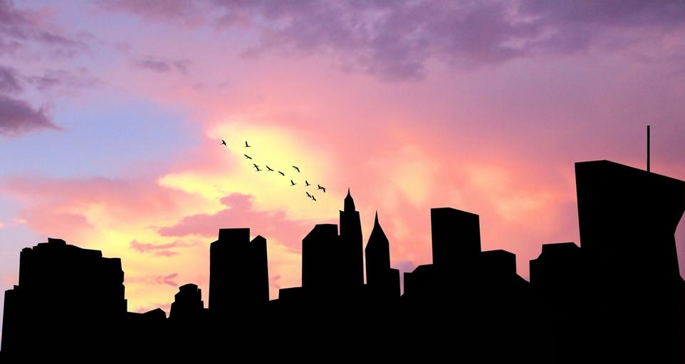 Keywords: against light clouds sky clouds in the sun silhouette landscape fire clouds west sunset city buildings urban birds vista