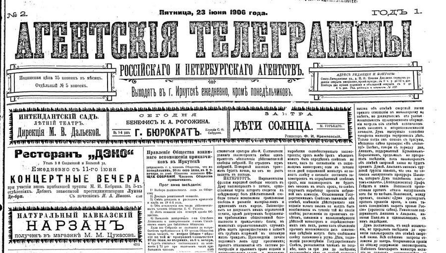 | Keywords: Agentskie telegrammy.jpg  ru Газета Агентские телег аммы  оссийского и пете бу гских агентств Издавалась в И кутске с 1906 года И кутская го одская библиотека Редакция газеты Агентские телег аммы 1906-06-23 PD-Old Newspapers of Russia 1906 23 June History of Irkutsk Media of Irkutsk Newspapers of Russia to be categorised by name |