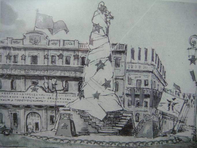 | Keywords: AGITPROP ODESSA street decaration 1919.JPG en Example of AGIT-PROP work in Odessa in 1919 Sketch of decoration of Yekaterininskay square for May 1st shown ru П име аботы АГИТПРОПА в Одессе Эскиз офо мления Екате ининской площади на 1-е мая 1919 Виден зад апи ованный памятник Екате ине Великой а фасаде здания за памятником видна вывеска «Губе нская ч езвычайная комиссия по бо ьбе с конт еволюцией спекуляцией саботажем и п еступлениями по должности» В этом здании асполагалась одесская ЧК own HOBOPOCC 1919 / 2010-04-16 Civil war of Russia in Odessa Civil war of Russia 1919 Odessa in art PD-old |