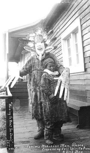| Keywords: Aglegmiut shaman in costume, with boy, ca 1912 (THWAITES 115).jpeg check categories 27 October 2016 3 Photograph Creator John E Thwaites Although forbidden by the Christian missionaries these masks and outsized hands were still made and used in the early 1900s by the Aglegmiut The photographs taken by John Thwaite are believed to be the only images of an actual shaman wearing these ceremonial costumes Caption on image Eskimo medicine man Alaska exorcising evil spirits from a sick boy Working to beat the Devil PH Coll 247 156 Subjects LCTGM Shamans--Alaska--Nushagak; Boys--Alaska--Nushagak; Benches--Alaska--Nushagak; Wooden sidewalks--Alaska--Nushagak Subjects LCSH Koniagmiut Eskimos--Clothing--Alaska--Nushagak; Koniagmiut Eskimos--Alaska--Nushagak--Rites and ceremonies; Eskimo children--Alaska--Nushagak depicted place United States--Alaska--Nushagak ca 1912 Institution University of Washington UWASH-THWAITES-source accession number thwaites 115 PD-old-auto-1923 1940 Information field Order Number THW093 Images from the John E Thwaites Photographs of Alaska Collection to check Shamans Boys Benches |