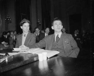 | Keywords: Agnes Reynolds and Joseph P Lash 1939.jpg en Before Dies Committee Washington D C Dec 1 1939 The Dies Committee Investigating un-American activities today questioned Joseph P Lash Executive Secretary of the American Students' Union and Miss Agnes Reynolds College Secretary of the Union Lash testified that he was a member of the Socialist Party from 1929 to 1937 He said he resigned because he believed that the Socialist Party was subordinating the interests of the people of a whole to the interests of factional strife http //hdl loc gov/loc pnp/hec 27744 Harris and Ewing 1939-12-01 PD-Harris-Ewing Files by User Cuppysfriend 1939 in Washington D C Committees of the United States House of Representatives |