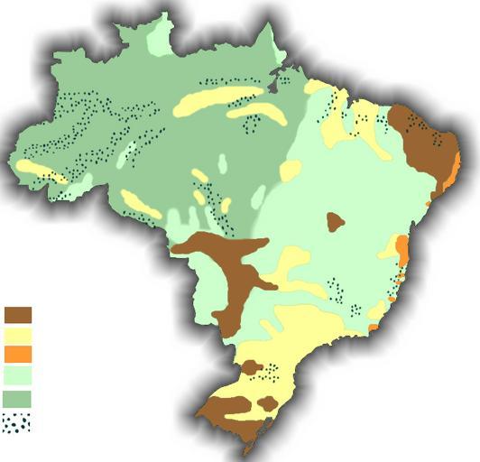 | Keywords: Agricultura no Brasil.png Map of agriculture in Brazil<br>brown- grains; yellow- mixed farming; orange- monoculture; green-clear- pastures; green- forest; stippled- extractivism Own 2009-03-09 André Koehne File Agricultura no Brasil legenda png Agricultural maps of Brazil Sent by André Koehne |