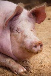 Keywords: agriculture animal domestic ear farm hairy head nose pig piggy pink pork portrait snout swine closed eyes