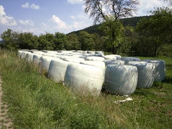 Keywords: agriculture cattle feed silo food wrapped up round bales bale slide meadow plastic packed single hull white harvest straw bales pet food packaging stock harvest time role feed stock silage bales