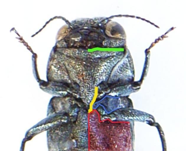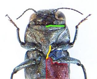 | Keywords: Agrilus ater detail.JPG Detail of underside of Agrilus ater<br>rechts eingefärbt<br>grün Vorderende des Kinnfortsatzes der Vorderbrust<br>ocker Prosternalfortsatz <br> blau Mittelbrust <br>rot Hinterbrust Photo made by myself 2007-10-14 Siga public domain Agrilus ater Underside of Coleoptera thorax |