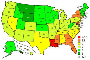 Keywords: AIDS diagnoses in the US.svg en AIDS cases reported in the United States in 2014 per 100 000 population The rate doubled in 1993 because of a change in the definition of AIDS Data from CDC http //www cdc gov/hiv/library/reports/surveillance/index html HIV Surveillance Reports 2016-04-10 own Delphi234 other versions current annually Data Data for 1982 to 1985 is cumulative reported case rate 1986 to present is that year The data is as follows wikitable sortable - Residence 1982 1983 1984 1985 1986 1987 1988 1989 1990 1991 1992 1993 1994 1995 1996 1997 1998 1999 2000 - Alabama - - 0 3 1 0 0 8 3 8 5 2 5 2 5 9 9 2 10 6 17 5 13 8 15 0 14 2 13 1 11 1 10 8 10 8 - Alaska - - - - 2 6 2 7 3 2 3 1 4 4 3 2 3 1 11 5 9 8 11 5 6 0 8 4 4 7 2 3 3 7 - Arizona - 0 3 1 0 2 5 2 4 6 4 8 0 9 3 8 5 7 5 10 0 30 9 15 0 15 7 13 3 9 8 13 6 18 3 8 6 - Arkansas - - - 0 5 1 3 2 0 3 3 3 3 8 9 8 2 11 6 16 6 11 6 11 1 10 7 9 6 8 0 7 6 7 2 - California 0 4 2 7 6 7 13 8 10 1 17 7 20 6 22 4 24 7 25 3 28 4 59 9 38 6 35 0 29 8 21 6 17 2 16 3 13 8 - Colorado - 0 8 2 0 4 0 5 2 6 8 9 6 11 5 10 9 12 8 11 7 37 1 22 2 17 9 13 6 9 8 7 9 7 7 7 8 - Connecticut - 0 9 2 7 5 4 4 7 7 7 12 9 13 3 12 9 17 2 19 8 53 5 27 9 50 3 34 0 37 4 20 4 17 8 18 0 - Delaware - - - 2 6 3 5 6 3 9 7 12 1 14 0 12 8 20 0 53 5 38 0 44 1 39 4 31 3 23 0 24 4 28 0 - District of Columbia - 3 5 17 7 44 8 35 6 74 8 81 0 80 7 121 9 118 6 122 7 274 2 246 9 185 2 233 3 188 2 189 7 160 9 152 9 - Florida 0 3 2 0 4 9 9 5 8 3 13 7 22 0 27 5 31 1 41 5 37 7 79 8 61 1 56 3 50 6 41 2 35 8 35 9 30 6 - Georgia 0 1 0 6 1 6 5 1 5 0 8 2 13 3 17 1 18 9 22 0 20 3 41 2 32 1 32 0 33 0 23 0 16 8 21 6 15 0 - Hawaii - - 1 9 4 6 5 2 7 5 9 3 16 1 14 1 17 4 11 9 30 8 18 3 21 9 16 8 8 0 13 3 8 4 9 5 - Idaho - - - - 0 3 1 0 1 1 2 3 2 8 3 2 3 3 6 5 5 4 4 1 3 2 4 3 2 6 2 0 1 7 - Illinois - 0 5 1 4 3 1 3 2 5 5 8 6 9 8 11 2 13 9 16 3 25 3 26 0 18 8 18 5 15 3 10 7 12 9 14 1 - Indiana - - 0 5 1 0 1 2 2 4 1 5 7 1 5 3 5 6 7 0 16 6 10 7 9 0 10 1 8 8 8 2 6 1 6 3 - Iowa - - - 0 6 0 7 1 0 1 5 2 0 2 4 2 9 4 0 7 2 4 6 4 1 3 9 3 5 2 5 3 0 3 1 - Kansas - - - 0 7 1 4 2 0 3 6 4 5 5 5 4 0 7 6 14 0 9 1 11 9 8 9 6 1 4 7 6 4 4 7 - Kentucky - - 0 4 0 8 0 8 1 3 2 4 3 1 5 2 4 4 5 7 8 5 8 3 7 7 10 3 9 3 7 1 7 0 5 2 - Louisiana - 0 4 1 7 3 9 3 6 7 4 8 8 11 5 16 7 18 7 18 8 33 5 28 5 24 9 33 7 25 0 21 7 19 6 14 8 - Maine - - - 0 9 1 8 2 5 2 3 5 4 5 4 4 0 3 6 12 0 9 4 10 4 4 0 4 1 2 5 6 4 3 1 - Maryland - 0 6 1 9 5 2 4 2 10 3 12 0 15 3 20 8 19 9 24 4 50 8 53 7 50 9 44 4 36 3 31 8 29 4 27 4 - Massachusetts - 0 8 2 3 6 0 4 8 7 8 12 1 12 8 14 0 16 1 14 4 44 8 22 9 23 7 21 4 13 9 14 7 23 1 18 6 - Michigan - 0 1 0 5 1 2 1 6 2 3 5 0 5 5 6 2 6 6 7 8 19 3 10 8 12 5 9 9 9 0 7 2 6 5 7 6 - Minnesota - - 0 5 1 4 2 3 3 1 3 9 4 1 4 6 4 9 4 9 14 6 9 2 7 9 6 5 4 5 4 0 4 0 3 7 - Mississippi - - - 0 5 1 1 2 0 4 7 6 3 10 7 7 6 10 0 16 8 16 1 16 3 16 6 12 6 15 1 15 1 15 0 - Missouri - - 0 7 1 7 1 5 4 6 8 0 8 6 11 4 12 7 13 8 32 9 13 4 14 8 15 9 10 5 8 1 9 7 8 1 - Montana - - - - 0 6 0 8 1 9 1 6 2 1 3 7 2 4 3 8 3 5 2 9 3 9 4 7 3 3 1 5 1 8 - Nebraska - - - - 0 7 1 5 3 2 2 1 3 7 4 0 3 8 11 1 5 4 7 0 6 0 5 5 4 3 4 0 4 5 - Nevada - - 1 2 2 6 3 9 9 2 11 8 16 7 15 8 20 4 18 6 46 1 26 3 32 2 26 6 35 0 14 8 13 4 14 0 - New Hampshire - - - - 1 2 3 1 3 6 3 3 5 9 4 7 4 3 11 0 8 1 9 6 8 0 4 7 3 1 3 9 2 4 - New Jersey 0 4 2 6 6 4 12 7 10 1 19 8 31 9 28 7 31 8 29 7 26 0 68 4 61 7 55 3 44 7 40 1 26 1 25 0 22 2 - New Mexico - - - 1 3 1 6 3 1 3 8 6 1 7 2 7 2 6 8 18 1 12 9 9 7 12 0 9 7 12 1 5 3 7 9 - New York 1 3 7 8 16 9 30 8 20 8 22 2 38 9 33 5 46 6 45 1 46 3 95 8 81 1 68 0 68 2 72 3 47 7 42 2 33 2 - North Carolina - - 0 4 1 4 1 3 3 3 4 3 6 8 8 5 8 9 8 5 19 7 16 8 13 9 12 3 11 4 10 5 10 4 8 3 - North Dakota - - - - 0 4 0 1 0 4 1 2 0 3 0 8 1 4 1 7 3 3 0 8 1 9 1 9 1 1 1 1 0 5 - Ohio - 0 1 0 4 0 9 1 9 3 1 4 7 4 5 6 1 5 7 7 0 14 3 10 7 9 9 10 4 7 6 6 1 4 9 5 2 - Oklahoma - - 0 5 1 0 1 3 3 2 4 4 5 1 6 5 6 0 8 5 22 4 8 2 9 0 8 3 8 5 8 6 4 4 10 2 - Oregon - - 0 8 1 9 2 5 5 9 6 5 8 2 11 8 8 8 9 7 25 5 19 6 14 5 14 4 9 3 6 2 6 8 6 1 - Pennsylvania 0 06 0 4 1 2 2 5 2 6 5 5 7 3 8 9 10 0 10 2 11 2 26 5 20 8 19 7 19 4 15 9 14 5 16 4 13 5 - Rhode Island - - 1 1 2 4 3 1 7 0 8 6 8 8 8 8 9 2 10 7 34 7 27 7 22 3 17 9 15 4 12 8 10 8 9 4 - South Carolina - 0 3 0 6 1 7 1 6 2 4 5 0 9 4 10 1 9 4 11 0 40 5 31 6 26 6 23 0 20 3 20 2 24 6 19 6 - South Dakota - - - - 0 3 0 3 1 0 0 6 1 3 0 6 1 1 4 0 2 8 2 5 1 9 1 5 1 8 2 2 1 1 - Tennessee - - - 0 6 1 6 1 5 6 8 5 4 7 0 7 1 8 1 23 6 14 5 17 0 15 5 14 4 12 8 13 8 14 7 - Texas 0 07 0 7 2 2 5 2 5 7 9 8 12 8 14 0 19 7 17 7 16 6 41 6 31 8 23 7 25 1 24 1 20 0 15 7 12 6 - Utah - - - 1 8 1 3 2 3 4 7 4 3 5 7 7 6 7 5 14 2 8 0 8 4 9 6 7 4 6 6 7 2 6 6 - Vermont - - - - 0 9 2 8 2 0 3 6 3 9 3 0 4 6 12 7 6 5 7 4 4 3 4 9 3 4 3 5 6 2 - Virginia - 0 5 1 2 3 1 2 7 4 2 5 8 6 4 12 0 10 8 12 2 25 1 17 6 24 3 17 9 17 4 14 7 13 6 12 3 - Washington - 0 2 1 6 4 2 3 9 7 4 7 7 10 6 14 6 11 4 11 0 29 6 17 4 16 2 14 5 11 3 7 7 6 2 8 4 - West Virginia - - - 0 6 0 4 1 1 1 0 2 9 3 6 3 4 3 1 5 8 5 0 6 8 6 6 6 9 4 6 3 8 3 4 - Wisconsin - - 0 3 0 8 0 9 2 0 2 3 2 7 4 3 4 3 4 6 14 5 7 3 6 8 5 3 4 9 3 9 2 9 4 0 - Wyoming - - - - 0 8 0 2 1 2 3 3 1 1 3 7 1 1 8 5 4 0 3 8 1 5 3 3 1 2 3 1 2 2 - class sortbottom Total 0 07 1 3 3 3 6 6 5 4 8 7 12 6 13 6 16 7 17 3 18 0 40 0 29 8 27 0 25 1 21 7 17 0 16 4 14 3 wikitable sortable - Residence 2001 2002 2003 2004 2005 2006 2007 2008 2009 2010 2011 2012 2013 2014 - Alabama 9 8 9 7 10 2 10 3 11 2 10 1 8 4 8 7 5 0 6 1 8 1 8 4 11 1 7 4 - Alaska 3 2 5 5 3 7 8 2 3 6 5 8 4 7 3 2 2 7 5 3 4 0 2 8 2 5 2 0 - Arizona 10 0 11 6 10 4 9 5 10 5 8 3 9 2 9 1 9 0 8 4 6 6 5 1 5 8 4 8 - Arkansas 7 3 8 8 6 7 6 5 8 5 9 0 6 9 5 3 6 8 5 4 4 7 3 8 6 5 5 0 - California 12 4 12 1 16 3 12 9 11 3 11 0 13 5 13 2 10 2 11 5 9 6 7 8 7 1 5 7 - Colorado 6 5 7 2 7 7 7 2 7 5 6 7 7 3 7 5 6 2 6 5 5 0 4 6 3 9 3 5 - Connecticut 16 9 17 7 20 7 17 9 18 8 11 7 15 1 10 1 9 7 11 3 9 1 7 5 6 6 5 3 - Delaware 31 1 23 9 26 4 18 6 21 0 13 7 19 8 16 8 18 0 15 1 11 6 11 8 11 6 8 9
