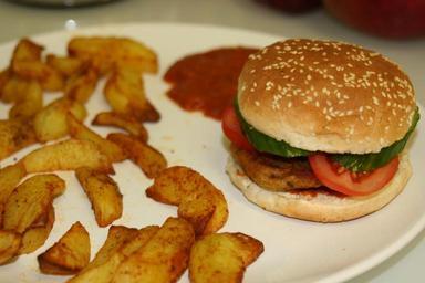 Keywords: Ailin28VeganBurger.JPG en Vegan burger with French fries own AilinParsa Cc-zero Vegan food Veggie burgers French fries at unknown location