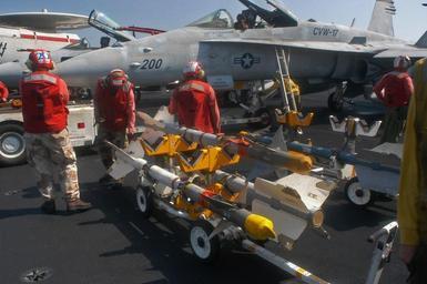 | Keywords: AIM-9 Sidewinder.jpg Arabian Gulf - Aviation Ordnanceman prepare to load a skid of AIM-9 Sidewinder air-to-air missiles on an F/A-18 Hornet assigned to the Blue Blasters of Strike Fighter Squadron Three Four VFA-34 aboard USS John F Kennedy CV 67 AIM-9 響尾蛇 式紅外線導引空對空飛彈 AIM-9響尾蛇 Sidewinder 式空對空飛彈是 種廣為西方 家使用的制式空戰武器,其使用紅外線追熱的方式來 行導引 紅外線追蹤飛彈的優點為成 低廉且發射後可以不予理 ,但缺點則是容易被熱焰片 Flares 或太陽等高溫的物體干擾 誤導失準 中 見是 組航空母艦上的後勤人員正 搬運要 載 F/A-18戰機上的響尾蛇飛彈 照片下載自http //www news navy mil/ 美 海軍官方新聞網站,由美 海軍開放照片版權至公共領域 删除该图像的 修订版 当前 http //www navy mil/view_image asp id 17036 2004-08-13 U S Navy photo by Photographers Mate 3rd Class Joshua Karsten PD-USGov-Military-Navy Aboard USS John F Kennedy CV-67 AIM-9 Sidewinder F/A-18 Hornet on flight decks Strike Fighter Squadron 34 United States Navy |