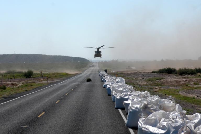 Keywords: Air Cav. Bde. Chinooks fight off flood DVIDS118247.jpg en A CH-47F Chinook helicopter from the Company B Black Cats 2nd Battalion 227th Aviation Regiment 1st Air Cavalry Brigade 1st Cavalry Division approaches a road in Presidio Texas to pick up sand bags Sept 22 2008 The Black Cats are currently supporting flood relief efforts for the town of Presidio by dropping the oversized sandbags on a levee to keep the high waters of the Rio Grande River from flooding the city 2008-09-22 https //www dvidshub net/image/118247 118247 2008-09-26 08 22 US PD-USGov CH-47 Chinook 1st Cavalry Division United States Images from DoD uploaded by Fæ
