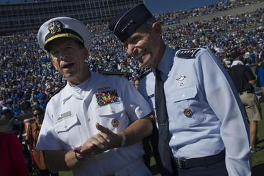 | Keywords: Air Force versus Navy football game DVIDS326058.jpg en Chairman of the Joint Chiefs of Staff Adm Mike Mullen left and U S Air Force Gen Norton A Schwartz chief of staff U S Air Force meet on the Falcon Stadium field prior to kickoff of the U S Air Force Academy Falcons versus the U S Naval Academy Midshipmen football game in Colorado Springs Colo The Falcons defeated the Midshipmen 14-6 2010-10-02 Petty Officer 1st Class Chad McNeeley https //www dvidshub net/image/326058 101002-N-+++++-170 2010-10-05 18 49 COLORADO SPRINGS CO US PD-USGov-Military-Navy Michael G Mullen Falcon Stadium Images from DoD uploaded by Fæ |