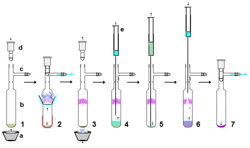 Keywords: Air-free sublimation.png Air-free sublimation <U>Apparatus</U> a Rubber cone typically used to form a vacuum seal in a Büchner flask filtration which is selected so as to fit snugly around the neck of the Schlenk tube b Schlenk tube c Gas/vacuum inlet d Teflon tap or stopcock e Syringe <u>Method steps</u> 1 Impure solid to sublime brown is placed in a Schlenk tube avoiding contaminating the sides of the tube e g by careful evaporation from a solution containing the brown solid 2 Rubber cone black is pushed near top of the Schlenk tube forming a tight seal around flask and filled with a coolant such as dry ice/acetone blue/white to cool the neck of the Schlenk tube The bottom of the Schlenk tube is heated red shading under vacuum blue arrow so that the impure solid brown sublimes as a pure solid purple at the cooled neck area blue shading 3 After sublimation the cooling-cone black is removed leaving the concentrated impurity as a residue dark brown in the bottom of the flask and the purified sublimed solid purple at the neck of the Schlenk tube 4 Solvent blue is inserted via syringe to dissolve the residue green/brown taking care to avoid washing off the sublimed solid purple 5 Residue solution is then removed by syringe green/brown Steps 4 and 5 can be repeated as required 6 Purified sublimed solid purple is washed off the neck of the flask with fresh solvent blue via a syringe In steps 3 to 6 the flask is held under an atmosphere of an inert gas via Schlenk tube side arm 7 Solvent is removed under vacuum to give the purified sublimed solid dark purple Steps 6 and 7 are not essential Own Quantockgoblin Schlenk flasks Sublimation