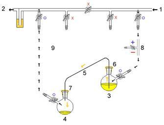 | Keywords: Air sensitive cannula -extra-bleed valve.png Air sensitive cannula - extra-bleed valve 1 Pressure in gas in 2 Pressure out oil bubbler orange 3 Higher flask with transfer liquid yellow to transfer 4 Lower receiving flask/transfered liquid yellow 5 Liquid transfer cannula 6 Septum orange on transfer flask 7 Septum orange on receiving flask 8 Pressure-control regulator/stopcock 9 Tubing/ gas-line not shown for clarity arrows show connectivity <font color blue>O</font> Open stopcock; <font color red>X</font> Closed stopcock; black-arrow Gas flow direction orange arrow Liquid flow direction <br> Note As the pressure-control regulator/stopcock 8 is gradually cloased pressure gradually builts up in flask 3 containing the fluid to be transferred Own Quantockgoblin chemistry Cannula transfer |