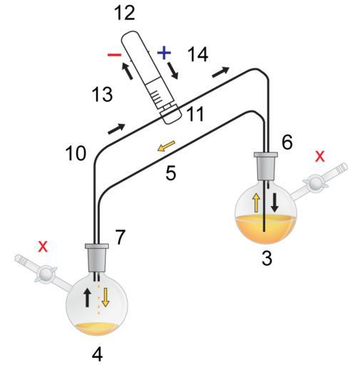 | Keywords: Air sensitive cannula - syringe valve 1.png en Air sensitive cannula - syringe valve 1 - 2 - 3 Higher flask with transfer liquid yellow to transfer 4 Lower receiving flask/transfered liquid yellow 5 Liquid transfer cannula 6 Septum orange on transfer flask 7 Septum orange on receiving flask 8 - 9 - 10 Gas cannula 11 2-way syringe stopcock 12 Gas-tight syringe 13 Gas/pressure removed from flask 4 14 Gas/pressure added to flask 3 <font color blue>O</font> Open stopcock; <font color red>X</font> Closed stopcock; black-arrow Gas flow direction orange arrow Liquid flow direction File Air_sensitive_cannula_-_syringe_valve png Quantockgoblin Ahnode 2008-08-09 File Air_sensitive_cannula_-_syringe_valve png Cannula transfer |