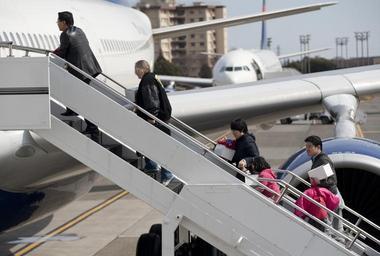 Keywords: aircraft commercial parked flight-line jet aviation passengers boarding stairs airport airplane steps
