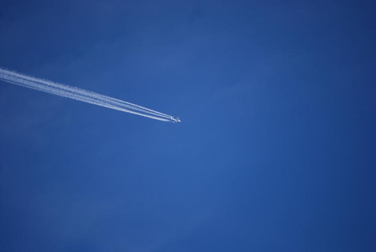 Keywords: aircraft contrail sky fly travel blue jet propulsion high flyer passenger aircraft partly cloudy
