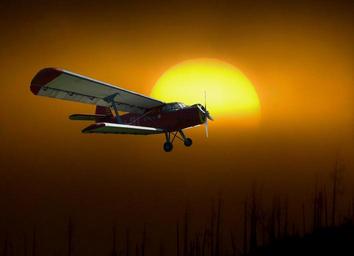 Keywords: aircraft double decker propeller plane sunrise sunset back light fly oldtimer flyer travel old nostalgia take off wing aviation flight sky above the clouds