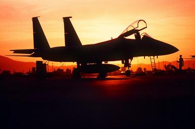 Keywords: aircraft military silhouette fighter jet plane f-15 maintenance crew dusk sunset aviation usa tarmac