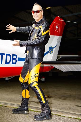 Keywords: aircraft wing fly human man leather suit leather pants portrait