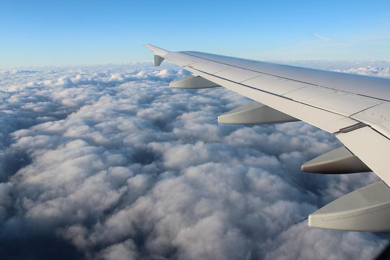 Keywords: aircraft wing fly sky clouds return flight home arrival travel aircraft window flyer outlook aerial view wanderlust holiday