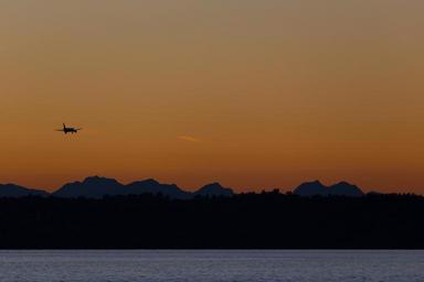 Keywords: airplane evening sunset ocean water flight journey aviation sky plane air travel aircraft transportation twilight dusk silhouettes mountain range