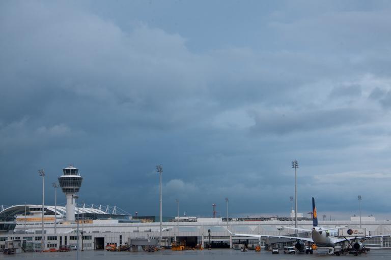Keywords: airport international munich architecture building transport lufthansa control tower tower air monitoring air traffic control light poles aircraft