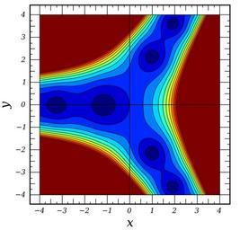 | Keywords: AiryBi Abs Contour.svg A surface plot of the absolute value of the Airy function <br> <math>f x \mathrm Bi x + iy \ </math><br> x and y both run from -4 to 4 self-made Mathematica 07/03/2008 Inductiveload Mathematica Code <pre><nowiki> conts ContourPlot AbsAiryBix + I y x -4 4 y -4 4 PlotRange -> 0 4 ContourShading -> False Contours -> 12 Frame -> False PlotPoints -> 100 </nowiki></pre> Airy function with complex arguments Contour plots | ||||