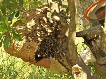 Keywords: Aixam agafat amb morrió.JPG swarm of bees collected with a muzzle own 2011-04-16 11 45 40 Chixoy Beekeeping in Balearic Islands