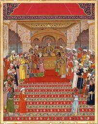 | Keywords: Akbar II in durbar.jpg en Painting opaque water colour and gold on paper Akbar II 1759-1837 r 1806-1837 in durbar holding court in the Diwan-i Khas of the Palace at Delhi This painting shows the emperor surrounded by the princes of the blood royal and on either side the nobles of the court Victoria and Albert Museum number 03535 IS http //collections vam ac uk/item/O397639/akbar-ii-1759-1837-r1806-painting-unknown/ author 1830 PD-Art-100 Akbar II Mughal art in the Victoria and Albert Museum Peacock Throne |