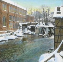 | Keywords: papir papirmøller industri fabrikkbygninger elver fosser oslo norway nor outdoor Håndkolorert dias. Bentse Bruk ved Akerselva, Norges første tresliperi, som kom i drift i 1863. I boken " Norsk landskap og norske menn" forteller Wilse: "På min videre ferd nådde jeg fram til Bentse Bruk ved Akerselven. Jeg så straks fra broen at her måtte det være noen gode motiver å forevige, og derfor fant jeg meg også en nedgang gjennom gjerdet og nedover skråningen. Jo, her var det motiver, en stille flytende elv med gjenspeiling av røde fabrikkbygninger, mens skinnende snø og blålige iskanter dannet en vakker og malerisk ramme om det mørke vannet. Hurtigst mulig ut med apparatet, for dagene er korte i januar på disse breddegrader. Men det varte heller ikke lenge før fine motiver vandret ned i vesken. Da så jeg at det noe nedenfor meg sto en høy herre i ulveskinnspels og malte. Og det var ingen ringere enn Norges store maler Fritz Thaulow. [...] Da sa Thaulow: - Kunne De gjøre meg den tjenesten å fotografere disse strømhvirvlene som De ser her i elven?" Håndkolorert dias. Bentse Bruk ved Akerselva, Norges første tresliperi, som kom i drift i 1863. I boken " Norsk landskap og norske menn" forteller Wilse: "På min videre ferd nådde jeg fram til Bentse Bruk ved Akerselven. Jeg så straks fra broen at her måtte det være noen gode motiver å forevige, og derfor fant jeg meg også en nedgang gjennom gjerdet og nedover skråningen. Jo, her var det motiver, en stille flytende elv med gjenspeiling av røde fabrikkbygninger, mens skinnende snø og blålige iskanter dannet en vakker og malerisk ramme om det mørke vannet. Hurtigst mulig ut med apparatet, for dagene er korte i januar på disse breddegrader. Men det varte heller ikke lenge før fine motiver vandret ned i vesken. Da så jeg at det noe nedenfor meg sto en høy herre i ulveskinnspels og malte. Og det var ingen ringere enn Norges store maler Fritz Thaulow. [...] Da sa Thaulow: - Kunne De gjøre meg den tjenesten å fotografere disse strømhvirvlene som De ser her i elven?" |
