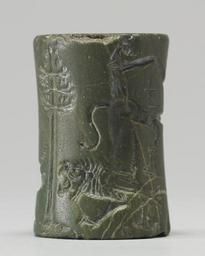 | Keywords: Akkadian - Cylinder Seal with King or God and Vanquished Lion - Walters 42674 - Side E.jpg The scene on this seal features a central motif of a tree On one side a bearded hero is holding an inverted bovid; on the other a bull man is holding an inverted lion There are cuneiform inscriptions running through the scene in two places La escena en este sello muestra un adorno central de un árbol Por un lado un héroe barbudo esta sujetando un bóvido invertido por el otro lado un hombre toro esta sujetando un león invertido Hay inscripciones cuneiformes a lo largo de la escena en dos áreas date Old Akkadian green stone cm 2 1 accession number 42 674 4594 Sadie Jones Mrs Henry Walters New York date and mode of acquisition unknown Sale Joseph Brummer New York 1941 Walters Art Museum 1941 by purchase Museum purchase 1941 Inscription place of origin Egypt Walters Art Museum license Akkadian cylinder seals Cylinder seals in the Walters Art Museum Lions in art of the ancient Near East Animals in art of the ancient Near East Trees in art of the ancient Near East Walters cylinder seal 42674 Cuneiform on cylinder seals Walters Art Museum cylinder seals with cuneiform Media contributed by the Walters Art Museum needs category review |