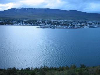 Keywords: akureyri iceland town mountains fjord bay harbor water reflections sky clouds nature outside
