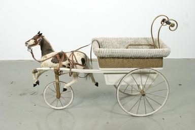 | Keywords: Åkvagn m häst, vänster sida - Livrustkammaren - 31034.tif Liten vagn bestående av vagnskorg och en förspänd häst med seldon i miniatyr Vagnskorgen är försedd med handtag och kan dras som en barnvagn Den lille prinsen eller prinsessan kunde sitta i vagnen och samtidigt hålla i tömmarna Ekipaget rullar på tre hjul <br/><br/>Vagnskorg målad i vitt och guld bestående av två delar Den nedre delen är en trälåda där de vita fälten ramas in av målade guldlinjer På detta är fastsatt en överdel av korg med en målad 110 mm hög guldbård Kanterna på korgen är upptill omvikta och vitmålade Hela vagnskorgen är vitmålad inuti I trälådans sarg är fastskruvat en ställning av metall målad med guldfärg Över vagnskorgens bakre del sträcker sig två 250 mm höga stänger som bildar två voluter mellan vilka ett mörkt balusterformat trähandtag är fastskruvat Två 180 mm långa vita lister är fastsatta längs med vagnskorgens långsidor ca 20 mm ner från sargkanten Troligtvis har de använts som stöd för en nu försvunnen bänk där barnet har kunnat sitta Vagnskorgen är försedd med två stora hjul diam 510 mm med guldmålade ekrar och hjulskenor <br/><br/>Från vagnskorgen löper skaklar fram till hästen - en vit skäck med bruna fläckar och ögon av glas Hästens stomme består av trä Till denna har skarvats ihop delar av päls och skinn som sedan sytts ihop Svanens är gjord av grått tagel Manen består numera endast av några få strån Seldonen är i form av huvudlag och s k bröstsele bestående av däckel med tre tömlöpare ryggstycke svansrem och hintertyg brösta saknas Tömmarna löper genom de två yttersta tömlöparna fram till huvudlaget Till huvudlaget hör nackrem pannrem käkrem sidorem och körstång Hästen har skygglappar framför ögonen <br/>Både bröstsele och huvudlag är av brunt läder medmetalldetaljer <br/><br/>Hästen bärs upp av två tunna metallskenor mellan skaklarna Under hästens mage finns även en grövre guldmålad metallställning som förbinder hästen och skaklarna med det hjul som bär upp vagnens främre del Hjulet är av samma modell som föregående men något mindre 310 mm i diam original caption åkvagn m häst vänster sida ca 1906 size mm 510 hjul bak size mm 310 hjul fram size mm 800 size mm 340 korg ö marken size mm 400 vagnskorg size mm 800 mellan hjulnav size mm 600 största size mm 930 största size mm 1450 g 19000 LRK Hästen 1977 Prinsessor place of origin original filename lm_dig0640 52187 inventory number LRK 15620 31034 CC-BY-SA Samuel Uhrdin <gallery caption Different images of same object > File Åkvagn m häst höger sida - Livrustkammaren - 22472 tif File Åkvagn m häst snett framifrån - Livrustkammaren - 13909 tif </gallery> Samuel Uhrdin Horse equipment Media contributed by LSH dim-with multiple size templates Color images from Livrustkammaren Media contributed by LSH 2013-10 |