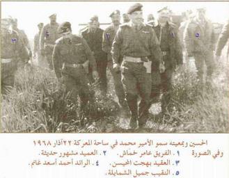 | Keywords: Al-karama.jpg هذا استخدام عادل لهذه الصورة فهي لشخصيات كلهم متوفين، كما أنها لحظة تاريخية لن تتكرر، والصورة هامة في موقع بهجت المحيسن في فقرة معركة الكرامة صورت عام1968 الصورة تشمل لقطة فيها الملك حسين يتفقد موقع لواء حطين في معركة الكرامة يرافقه بهجت المحيسن وأخرون King Hussein of Jordan in the company of Bahjat Al Muhaisen and others inspects the positions of the Hittin Brigade following the day of the Battle of Karameh in 1968 مجلة الأقصى 2007-09-19 --إبن البيطار 09 13 19 September 2007 UTC ترخيص حر PD-Jordan Hussein I of Jordan Bahjat Al Muhaisen Battle of Karameh Al-Aqsa magazine |