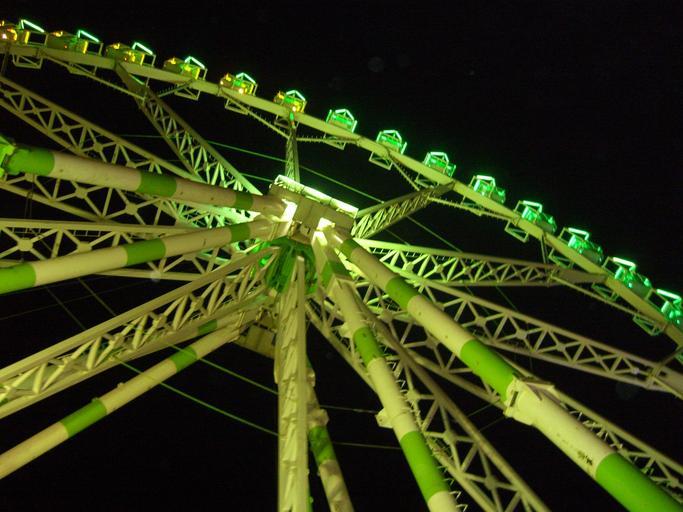 Keywords: Al pie de una Noria.JPG Noria de 60 m vista desde el pie de la misma puesta en las ferias de Valdespartera Zaragoza en la semana de fiestas del Pilar 2007 Own 2007-10-14 LenZai Ferris wheels in Spain Illuminated ferris wheels