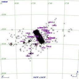 | Keywords: Aladin2011.03.31-SgrXR-1.png en Sky plot of the X-ray sources within the two error regions for each location of Sagittarius XR-1 The first detection at J2000 0 RA 17h 58m 11 13s Dec -29° 12' 14 9 has a 3° diameter error circle at the east This overlaps the large polygonal error box for the second detection at J2000 0 RA 17h 48m 12 31s Dec -30° 00' 58 6 which trends SE to NW in the sky plot The intense collection of X-ray sources within the polygon of the second detection is a series of deep penetration Chandra X-ray Observatory visibly dark X-ray sources Credit Aladin at SIMBAD Me using Aladin at SIMBAD url http //simbad u-strasbg fr/simbad/ Me and Aladin at SIMBAD 2011-03-31 I sent an email to question simbad u-strasbg fr regarding use of applet Aladin generated sky plots Pierre Fernique astro unistra fr stated There is absolutely no problem to use them for Wikipedia pages A citation of Aladin would be appreciated Legend X - X-ray source red + - HII region red - star red square - nebula LMXB - low-mass X-ray binary XB - X-ray binary gamma - gamma-ray source Nova-like - Nova-like star Seyfert - Seyfert galaxy Cc-zero X-ray astronomy Astronomical diagrams |