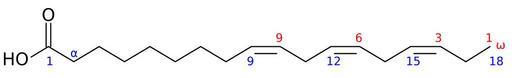 | Keywords: ALAnumbering.svg The chemical strucuture of alpha-linolenic acid showing physiological numbering red and chemical numbering blue conventions Chemical structure of alpha-linolenic acid showing differing numbering conventions created with ChemDraw en Image ALAnumbering png re-drawn in BKchem+perl+inkscape+vim 2007-10-23 en User Edgar181 I the creator of this work hereby release it into the public domain This applies worldwide In case this is not legally possible I grant any entity the right to use this work for any purpose without any conditions unless such conditions are required by law Edgar181 Polyunsaturated fatty acids Cis fatty acids |