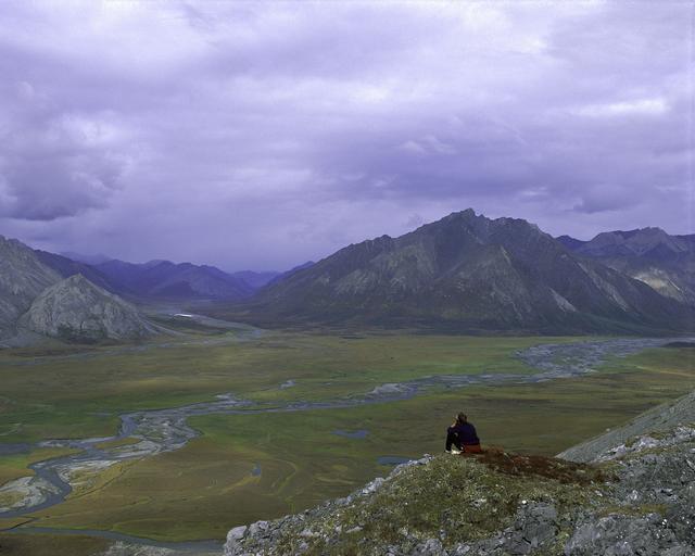 Keywords: alaska landscape mountains sky clouds valley ravine person rocks rocky nature outside scenic vista country countryside remote wilderness summer spring plants tundra grass