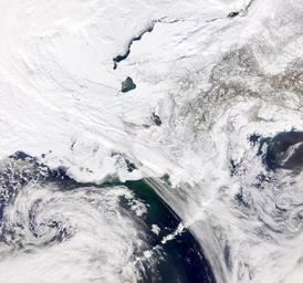 | Keywords: Alaska Snow Storm mar 18 2002.jpg en The forecast called for flurries but the snow accumulated on the ground in Anchorage Alaska at the rate of 2 inches per hour 5 cm per hour for much of Saturday March 16 2002 By the time the winter storm passed on Sunday afternoon Anchorage had received 28 6 inches 72 6 cm of snow surpassing by far the previous record of 15 6 inches 39 6 cm set on December 29 1955 Flights were canceled and schools were closed as a result of the storm This true-color image of Alaska was acquired by the Sea-viewing Wide Field-of-view Sensor SeaWiFS flying aboard the OrbView-2 satellite on March 18 It appears another large low-pressure system is heading toward the Anchorage region which could bring substantially more snowfall The low-pressure system can be identified by the characteristic spiral pattern of clouds located off Alaska southwestern coast in this scene http //earthobservatory nasa gov/NaturalHazards/view php id 9300 Image courtesy the SeaWiFS Project NASA/Goddard Space Flight Center and ORBIMAGE 2002-03-18 PD-SeaWiFS SeaWiFS images Storms in Alaska |