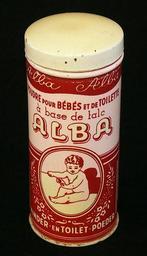 Keywords: Alba baby & toilet poeder blikje, foto1.JPG Very old Dutch product that is not produced and/or not sold any more own 2014-03-14 11 10 45 Alf van Beem CC-zero Trademarked Talcum powder tins