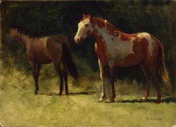 | Keywords: Albert Bierstadt - Two Horses.jpg Artwork Creator Albert Bierstadt oil paper cardboard in 13 875 19 625 Institution Buffalo Bill Historical Center Whitney Gallery of Western Art Collection object history credit line Gift of Carman H Messmore signet ABierstadt In preparation for his large landscapes Bierstadt made many small sketches and studies accession number 4 62 http //old bbhc org/collections/bbhc/WG_ObjectPage cfm museum WG VarObjectKey 47035 Whitney Gallery of Western Art PD-old-100 Paintings of animals by Albert Bierstadt Paintings in the Buffalo Bill Historical Center Paintings of horses |