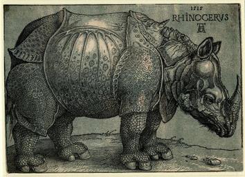| Keywords: Albrecht Dürer (Janssen chiaroscuro woodcut ) - Rhinoceros - BM 1913,1015.110.jpg Artwork Creator Albrecht Dürer mld Colour woodcut of a rhinoceros > 1620 woodcut Size mm 214 300 Institution British Museum Not on display accession number PD 1913 1015 110 object history http //www britishmuseum org/research/search_the_collection_database/term_details aspx bioId 128766 Purchased from Colnaghi 1913 exhibition history 2002/3 Dec-Mar BM Dürer and his Legacy no 244 2012 Apr-Aug UAE Abu Dhabi Treasures credit line Signed dated and titled on the block Dürer's woodblock passed into the hands of the Amsterdam printer and cartographer Willem Jaansen also known as Willem Blaeu http //www britishmuseum org/research/search_the_collection_database/term_details aspx bioId 92361 amongst other names Recognizing the block was old and very damaged Janssen re-issued the block with the addition of a new tone block printed in a variety of colours olive-green and dark green as well as blue-grey this version http //www britishmuseumshoponline org/content/ebiz/britishmuseumonlineshop/resources/books/Master_Prints_Close-Up/files/assets/basic-html/page6 html Master Prints Close-Up British Museum p 6 Meder 1932 273 7 Dodgson 1903 1911 I 307 125d eighth edition listed in CD's annotated copy Schoch 2001-04 II 241 7 Bartsch VII 147 136 http //www britishmuseum org/research/collection_online/collection_object_details aspx objectId 1342313 partId 1 people 92361 peoA 92361-2-70 view list sortBy objectTitleSort page 1 British Museum info http //www britishmuseum org/research/collection_online/collection_object_details/collection_image_gallery aspx assetId 72710001 objectId 1342313 partId 1 British museum image high resolution available for private research <gallery> File Dürer Albrecht ” Rhinozeros ” 1515 jpg High resolution scan of a British Museum postcard </gallery> PD-old-auto 1528 PD-US Dürer's Rhinoceros Prints by Albrecht Dürer in the British Museum Willem Janszoon Blaeu Uploaded with UploadWizard |