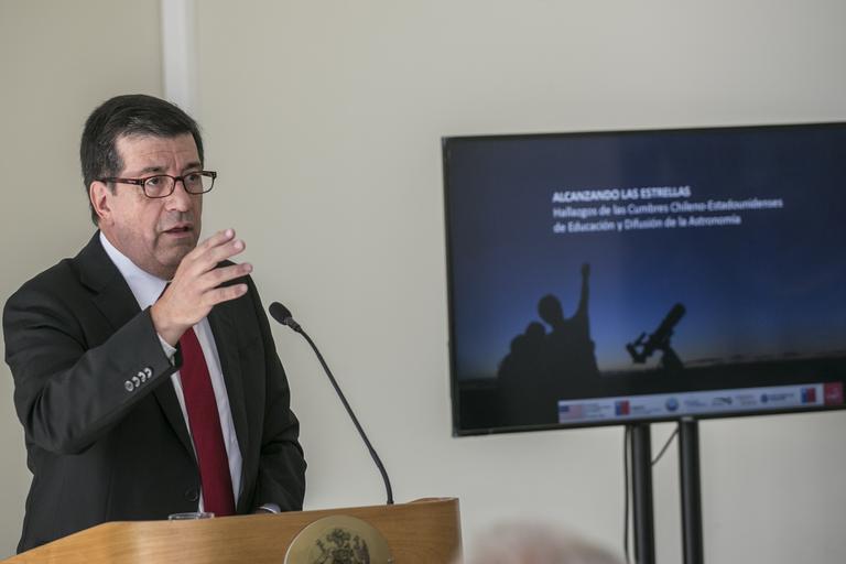 Keywords: people indoor “Alcanzando las Estrellas: Hallazgos de las Cumbres Chileno-Estadounidenses de Educación y Difusión de la Astronomía”, es el nombre del documento dado a conocer hoy y que representa el mayor esfuerzo nacional por coordinar estrategias en pos de potenciar la educación y difusión de la disciplina entre Chile y sus socios internacionales. Este informe sintetiza las ideas de más de cien expertos, representantes de 50 instituciones chilenas y extranjeras, que reconocieron el enorme potencial que posee Chile para convertirse en un referente mundial en educación y difusión pública de esta disciplina. Instituciones como los observatorios estadounidenses, conformados por AUI, AURA y Carnegie Institution for Science), la Embajada de Estados Unidos en Chile, CONICYT, Fundación Imagen de Chile y la Fundación Nacional de Ciencias de los Estados Unidos (NSF) participaron en las Cumbres Chileno-Estadounidenses de Educación y Difusión de la Astronomía. Para el año 2025 se proyecta que Chile poseerá el 75% de la capacidad de observación astronómica mundial. Con esta infraestructura no sólo se pueden responder preguntas que vinculan a la humanidad con el Universo, sino que el ser humano también es beneficiado educativamente en diversas áreas del saber. Para el embajador Gabriel Rodríguez, director de Energía, Ciencia y Tecnología e Innovación, del Ministerio de Relaciones Exteriores de Chile, “la astronomía no sólo permite responder preguntas sobre el origen de la vida y nuestro lugar en el cosmos, sino que además es una ciencia que nos acerca a la experiencia de transformar misterios ancestrales en conocimiento científico, a la vez que en saber cultural y sabiduría ciudadana, apropiados para hacer más humanos a todos los habitantes del planeta”. “El esfuerzo ofrecido por cada uno de los profesionales nacionales y extranjeros que aportaron generosamente su experiencia individual para agrupar los distintos puntos de vista de lo que está ocurriendo actualmente en materia de educación y difusión de la astronomía en Chile y el resto del mundo, constituye un recurso de gran utilidad para visibilizar buenas prácticas, y además favorece la futura colaboración entre quienes desarrollan iniciativas en esta área”, enfatizó el astrónomo Eduardo Hardy, que presentó el documento en representación de los observatorios estadounidenses. Las cumbres fueron visualizadas por los participantes como una oportunidad única para abordar, como comunidad, los problemas de coordinación y evaluación estratégica en la educación y difusión de la astronomía en Chile. Estas áreas de trabajo están desarrolladas en siete capítulos, y corresponden, por una parte, a la situación específica que experimenta en el plano nacional la educación y difusión de la astronomía en cinco campos ligados históricamente o en forma reciente con esta ciencia: la Educación Básica y Media; los planetarios, museos, centros de investigación y desarrollo científico y la educación no formal; los observatorios científicos internacionales; las universidades; y el astroturismo y los observatorios municipales y turísticos. Al final de cada capítulo se presenta un listado de recomendaciones y áreas de exploración futura, elaborado por cada grupo de trabajo. Las primeras se entienden como acciones concretas que, a juicio de los participantes, son posibles de implementar en el mediano y corto plazo. Las áreas de exploración futura, por su parte, corresponden a temas que requieren un mayor estudio y análisis antes de convertirse en recomendaciones factibles de ser implementadas. “Estamos conscientes que no sólo debemos centrar nuestra actividad en la entrega de fondos a los investigadores, para que lleven adelante proyectos a un nivel competitivo; también reconocemos la importancia y atractivo que despierta la disciplina en la sociedad. Por ello, pensamos que el rol de la astronomía en la educación de la ciencia debe transformarse en objetivo prioritario, en un tema clave para introducir un cambio”, comentó Christian Nicolai, director ejecutivo de CONICYT. Al finalizar la ceremonia, la profesora del Colegio Carlos Condell de la Haza, de La Serena, María Rebeca López, entregó a representantes de CONICYT el documento para que las recomendaciones y áreas de exploración que este texto incluye, sean puestas en acción con el respaldo de la principal institución pública del campo científico en Chile. "Estoy convencida que este documento será una brújula para nuestras autoridades a fin de potenciar y, ojala, priorizar a la astronomía como parte de nuestra identidad. Esta ciencia al alcance de mis estudiantes, contribuye e impulsa a que adquieran una visión mas amplia y enriquecedora del mundo en que les ha tocado vivir”, subrayó la docente. “Alcanzando las Estrellas: Hallazgos de las Cumbres Chileno-Estadounidenses de Educación y Difusión de la Astronomía”, es el nombre del documento dado a conocer hoy y que representa el mayor esfuerzo nacional por coordinar estrategias en pos de potenciar la educación y difusión de la disciplina entre Chile y sus socios internacionales. Este informe sintetiza las ideas de más de cien expertos, representantes de 50 instituciones chilenas y extranjeras, que reconocieron el enorme potencial que posee Chile para convertirse en un referente mundial en educación y difusión pública de esta disciplina. Instituciones como los observatorios estadounidenses, conformados por AUI, AURA y Carnegie Institution for Science), la Embajada de Estados Unidos en Chile, CONICYT, Fundación Imagen de Chile y la Fundación Nacional de Ciencias de los Estados Unidos (NSF) participaron en las Cumbres Chileno-Estadounidenses de Educación y Difusión de la Astronomía. Para el año 2025 se proyecta que Chile poseerá el 75% de la capacidad de observación astronómica mundial. Con esta infraestructura no sólo se pueden respond