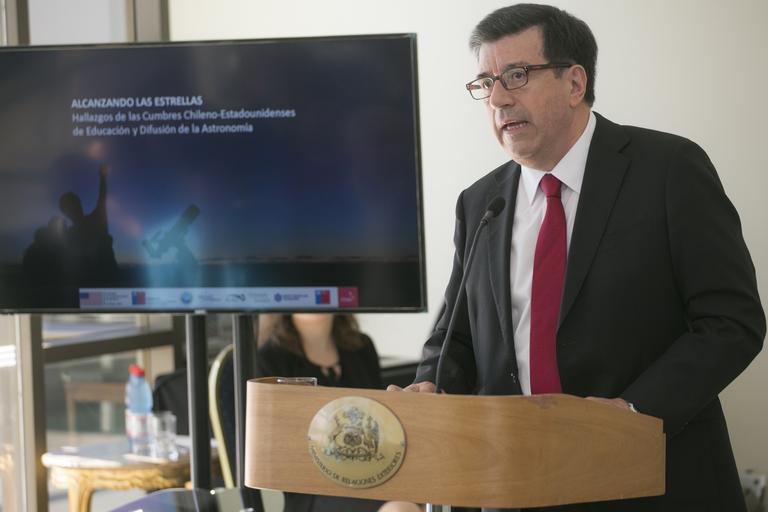 | Keywords: people indoor “Alcanzando las Estrellas: Hallazgos de las Cumbres Chileno-Estadounidenses de Educación y Difusión de la Astronomía”, es el nombre del documento dado a conocer hoy y que representa el mayor esfuerzo nacional por coordinar estrategias en pos de potenciar la educación y difusión de la disciplina entre Chile y sus socios internacionales. Este informe sintetiza las ideas de más de cien expertos, representantes de 50 instituciones chilenas y extranjeras, que reconocieron el enorme potencial que posee Chile para convertirse en un referente mundial en educación y difusión pública de esta disciplina. Instituciones como los observatorios estadounidenses, conformados por AUI, AURA y Carnegie Institution for Science), la Embajada de Estados Unidos en Chile, CONICYT, Fundación Imagen de Chile y la Fundación Nacional de Ciencias de los Estados Unidos (NSF) participaron en las Cumbres Chileno-Estadounidenses de Educación y Difusión de la Astronomía. Para el año 2025 se proyecta que Chile poseerá el 75% de la capacidad de observación astronómica mundial. Con esta infraestructura no sólo se pueden responder preguntas que vinculan a la humanidad con el Universo, sino que el ser humano también es beneficiado educativamente en diversas áreas del saber. Para el embajador Gabriel Rodríguez, director de Energía, Ciencia y Tecnología e Innovación, del Ministerio de Relaciones Exteriores de Chile, “la astronomía no sólo permite responder preguntas sobre el origen de la vida y nuestro lugar en el cosmos, sino que además es una ciencia que nos acerca a la experiencia de transformar misterios ancestrales en conocimiento científico, a la vez que en saber cultural y sabiduría ciudadana, apropiados para hacer más humanos a todos los habitantes del planeta”. “El esfuerzo ofrecido por cada uno de los profesionales nacionales y extranjeros que aportaron generosamente su experiencia individual para agrupar los distintos puntos de vista de lo que está ocurriendo actualmente en materia de educación y difusión de la astronomía en Chile y el resto del mundo, constituye un recurso de gran utilidad para visibilizar buenas prácticas, y además favorece la futura colaboración entre quienes desarrollan iniciativas en esta área”, enfatizó el astrónomo Eduardo Hardy, que presentó el documento en representación de los observatorios estadounidenses. Las cumbres fueron visualizadas por los participantes como una oportunidad única para abordar, como comunidad, los problemas de coordinación y evaluación estratégica en la educación y difusión de la astronomía en Chile. Estas áreas de trabajo están desarrolladas en siete capítulos, y corresponden, por una parte, a la situación específica que experimenta en el plano nacional la educación y difusión de la astronomía en cinco campos ligados históricamente o en forma reciente con esta ciencia: la Educación Básica y Media; los planetarios, museos, centros de investigación y desarrollo científico y la educación no formal; los observatorios científicos internacionales; las universidades; y el astroturismo y los observatorios municipales y turísticos. Al final de cada capítulo se presenta un listado de recomendaciones y áreas de exploración futura, elaborado por cada grupo de trabajo. Las primeras se entienden como acciones concretas que, a juicio de los participantes, son posibles de implementar en el mediano y corto plazo. Las áreas de exploración futura, por su parte, corresponden a temas que requieren un mayor estudio y análisis antes de convertirse en recomendaciones factibles de ser implementadas. “Estamos conscientes que no sólo debemos centrar nuestra actividad en la entrega de fondos a los investigadores, para que lleven adelante proyectos a un nivel competitivo; también reconocemos la importancia y atractivo que despierta la disciplina en la sociedad. Por ello, pensamos que el rol de la astronomía en la educación de la ciencia debe transformarse en objetivo prioritario, en un tema clave para introducir un cambio”, comentó Christian Nicolai, director ejecutivo de CONICYT. Al finalizar la ceremonia, la profesora del Colegio Carlos Condell de la Haza, de La Serena, María Rebeca López, entregó a representantes de CONICYT el documento para que las recomendaciones y áreas de exploración que este texto incluye, sean puestas en acción con el respaldo de la principal institución pública del campo científico en Chile. "Estoy convencida que este documento será una brújula para nuestras autoridades a fin de potenciar y, ojala, priorizar a la astronomía como parte de nuestra identidad. Esta ciencia al alcance de mis estudiantes, contribuye e impulsa a que adquieran una visión mas amplia y enriquecedora del mundo en que les ha tocado vivir”, subrayó la docente. “Alcanzando las Estrellas: Hallazgos de las Cumbres Chileno-Estadounidenses de Educación y Difusión de la Astronomía”, es el nombre del documento dado a conocer hoy y que representa el mayor esfuerzo nacional por coordinar estrategias en pos de potenciar la educación y difusión de la disciplina entre Chile y sus socios internacionales. Este informe sintetiza las ideas de más de cien expertos, representantes de 50 instituciones chilenas y extranjeras, que reconocieron el enorme potencial que posee Chile para convertirse en un referente mundial en educación y difusión pública de esta disciplina. Instituciones como los observatorios estadounidenses, conformados por AUI, AURA y Carnegie Institution for Science), la Embajada de Estados Unidos en Chile, CONICYT, Fundación Imagen de Chile y la Fundación Nacional de Ciencias de los Estados Unidos (NSF) participaron en las Cumbres Chileno-Estadounidenses de Educación y Difusión de la Astronomía. Para el año 2025 se proyecta que Chile poseerá el 75% de la capacidad de observación astronómica mundial. Con esta infraestructura no sólo se pueden respo