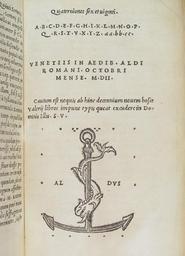 | Keywords: Aldus-page.jpg Alus Manutius' printer's device Dictorum et factorum memorabilium libri nouem Valerius Maximus Venice Aldus Manutius 1502 This page features Aldus Manutius' printer's device - an emblem designed by a printer for the easy identification of his product - of an anchor entwined by a dolphin PD-old-100 Aldus Manutius Printing Printer's marks Manutius Early printed books Valerius Maximus 1502 books Artworks missing infobox template | ||||