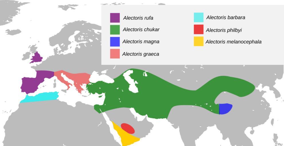 | Keywords: AlectorisChristensen.svg Distribution of Alectoris species based on Christensen GC 1970 The Chukar Partridge Biological Bulletin No 4 Nevada Department of Wildlife http //www ndow org/about/pubs/reports/1970_Chukar-Partridge_Bulletin pdf violet - Alectoris rufa green - Alectoris chukar blue - Alectoris magna salmon - Alectoris graeca light blue - Alectoris barbara red - Alectoris philbyi yellow - Alectoris melanocephala own 2010 L Shyamal Alectoris Galliformes distribution maps Alectoris rufa Alectoris chukar Alectoris magna Alectoris graeca Alectoris barbara Alectoris philbyi Alectoris melanocephala |